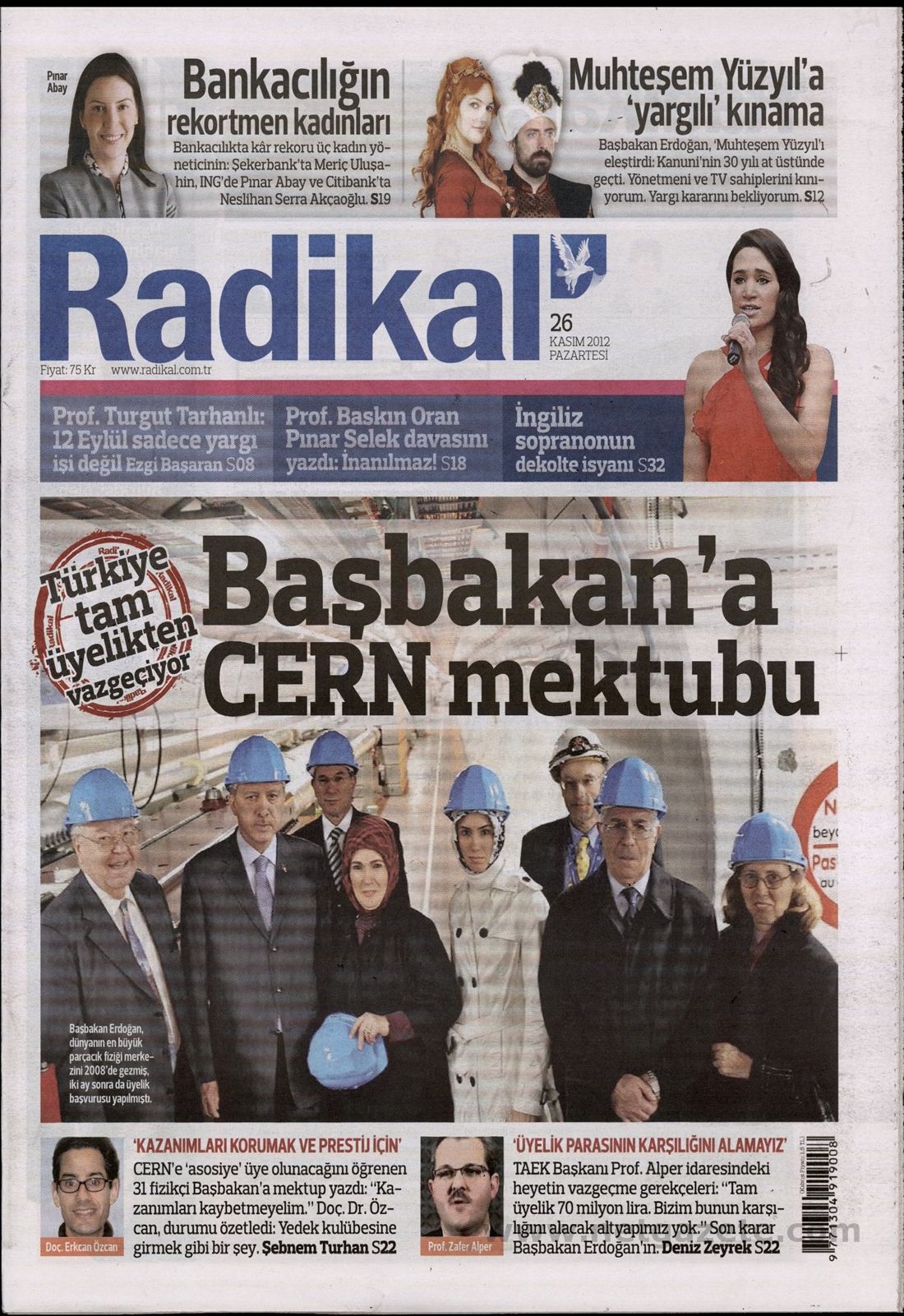 «Επιστολή CERN στον Ερντογάν-η Τουρκία αποσύρεται από την υποψηφιότητα πλήρους μέλους» είναι ο τίτλος της Radikal. Η τουρκική εφημερίδα αναφέρει πως το Επιστημονικό Συβούλιο της Τουρκίας αποφάσισε την απόσυρση της υποψηφιότητας στο ερευνητικό κέντρο CERN με έδρα την Ελβετία καθώς « θα επενδυθούν περίπου 30 εκατομμύρια Ευρώ χωρίς την αξιοποίηση των στοιχείων λόγω της έλλειψης της υποδομής στην Τουρκία»