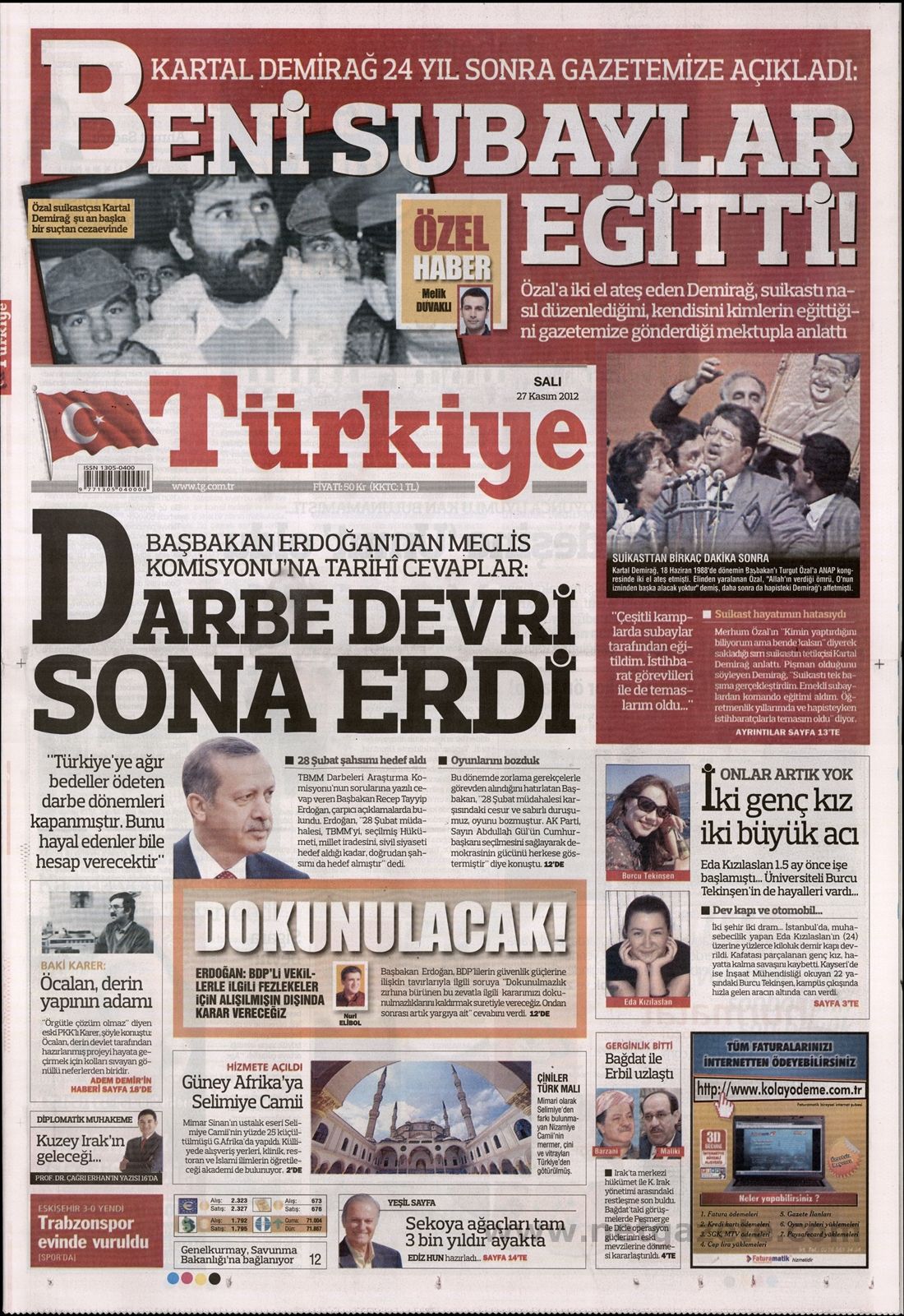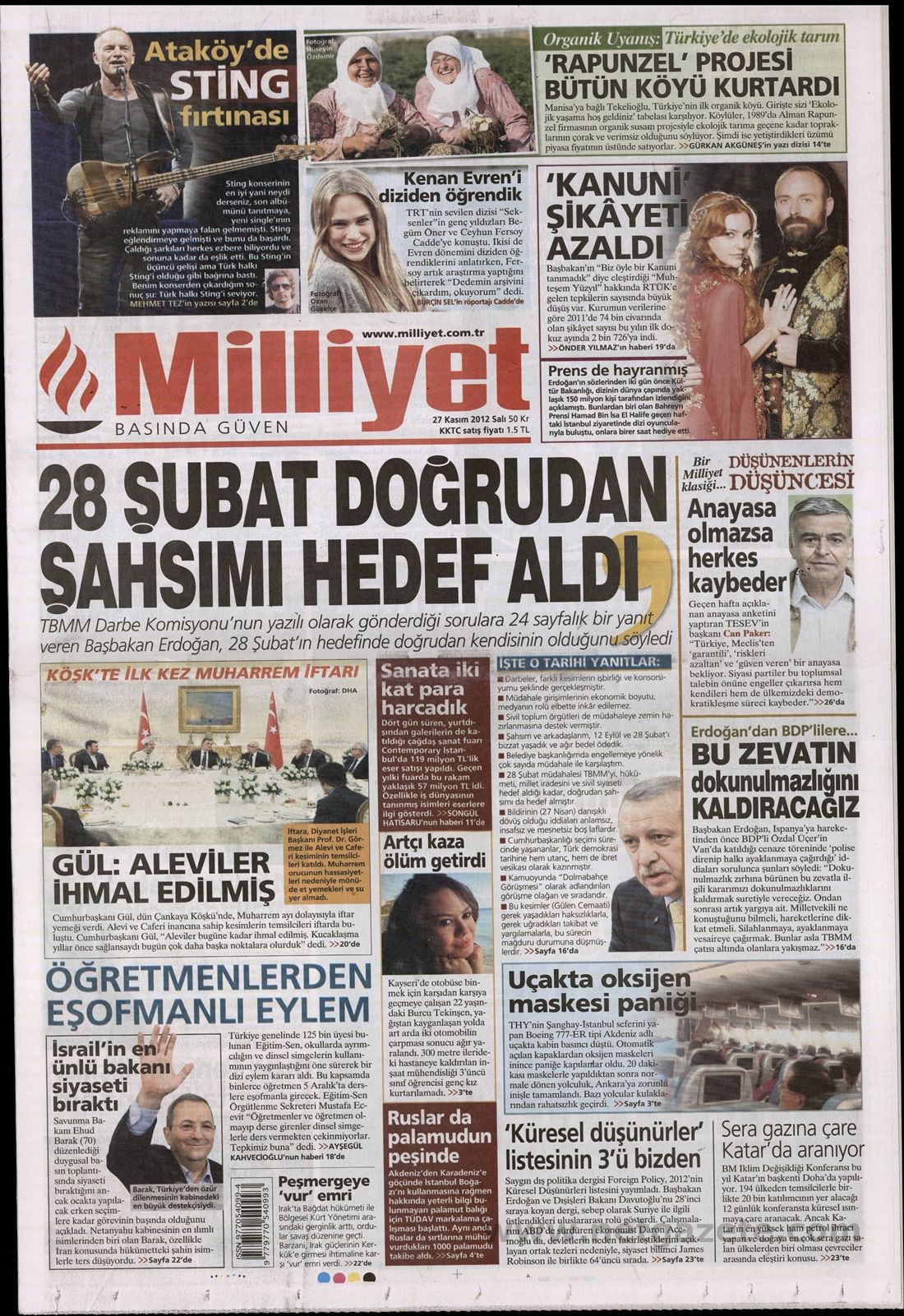 «Η 28η Φεβρουαρίου είχε ως άμεσο στόχο εμένα» είναι ο τίτλος της Milliyet. H τουρκική εφημερίδα κάνει αναφορά στη γραπτή αναφορά του Ερντογάν στην επιτροπή έρευνας των πραξικοπημάτων , και αναφέρεται στην προσπάθεια ανατροπής της κυβέρνησης το 1996. «Οσα ζήσαμε κατά τη διάρκεια της εκλογής προέδρου το 2007 είναι ντροπή στην ιστορία της τουρκικής δημοκρατίας» αναφέρει ο τούρκος πρωθυπουργός θυμίζοντας πως και τότε οι στρατηγοί είχαν προσπαθήσει να εμποδίσουν την εκλογή Γκιούλ.