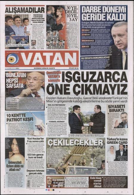 « Δεν θα βγούμε μπροστά, σαν πονηροί» είναι ο τίτλος της εφημερίδας Vatan. H τουρκική εφημερίδα κάνει αναφορά στις συνέντευξη του Αχμέτ Νταβούτογλου ο οποίος τονίζει πως στην κρίση της Γάζας η Αίγυπτος δέχθηκε τα συγχαρητήρια για τον ειρηνευτικό της ρόλο « η εκεχειρία πετύχε μετά από τη συνάντηση μου με την