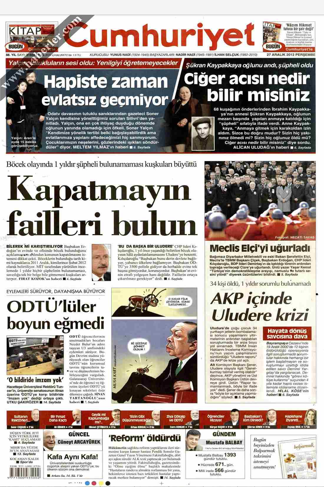 «Μην κλείνετε την υπόθεση» είναι ο τίτλος της Cumhuriyet. H τουρκική εφημερίδα αναφέρεται σε δηλώσεις του αρχηγού του Ρεμπουμπλικανικού Λαϊκού Κόμματος που αναφέρει πως «αυξάνονται οι υποψίες καθώς εδώ και ένα χρόνο δεν έχουν βρεθεί οι δράστες της υπόθεσης κοριών που κρυφάκουγαν τον Ερντογάν».