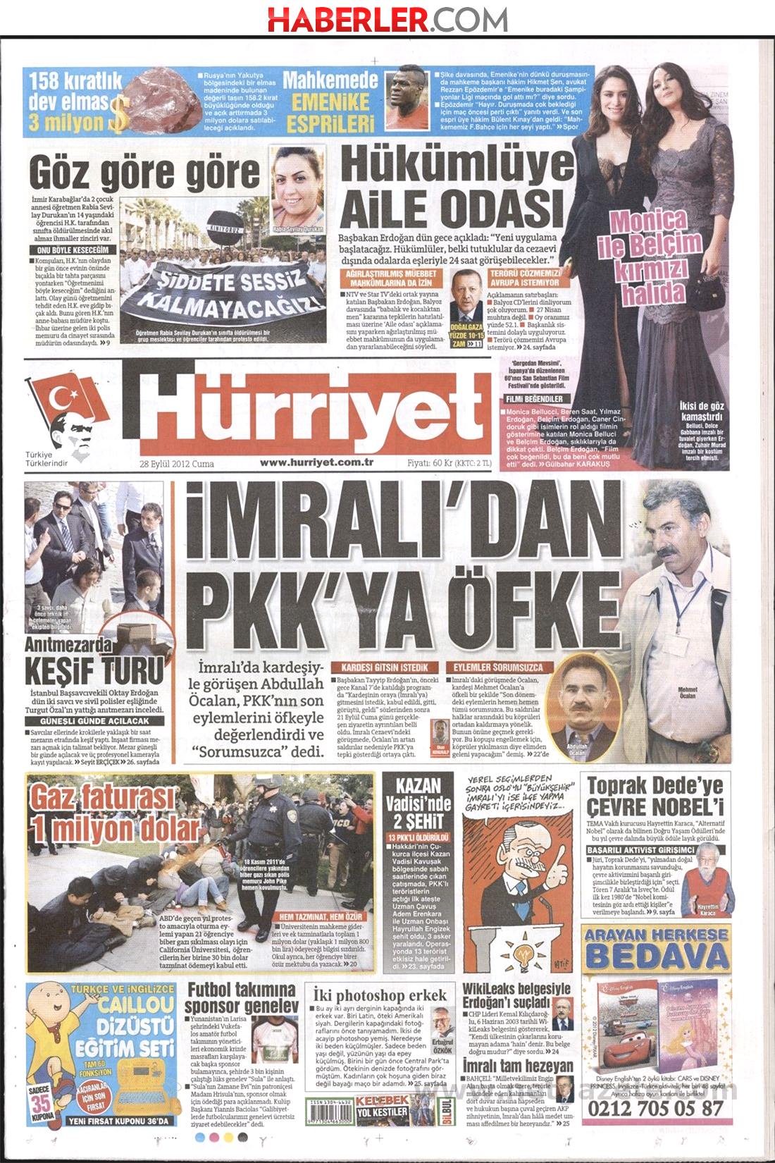 «Οργή στο PKK από το Ίμραλι» είναι ο τίτλος της Hürriyet. H τουρκική εφημερίδα αναφέρει πως ο Αμντουλάχ Οτζαλάν συναντήθηκε με τον αδελφό του και του δήλωσε πως είναι αντίθετος με τις τελευταίες επιθέσεις του PKK.