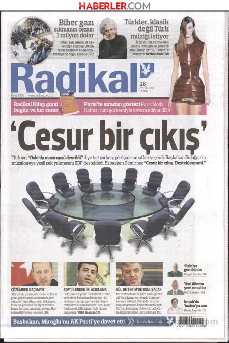 « Θαρραλέα κίνηση» είναι ο τίτλος της Radikal. Η τουρκική εφημερίδα αναφέρει πως « ο τούρκος πρωθυπουργός άναψε πράσινο φως για διαπραγματεύσεις για το Κουρδικό ζήτημα και βρήκε τη στήριξη του Κόμματος Ειρήνης και Δημοκρατίας» Ο πρόεδρος του φιλοκουρδικού αυτού κόμματος φέρεται να δηλώνει πως « η κίνηση του Ερντογάν πρέπει να στηριχθεί».