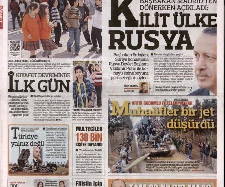 « Η κρίσιμη χώρα είναι η Ρωσία» είναι ο τίτλος της Türkiye. H τουρκική εφημερίδα κάνει αναφορά στις δηλώσεις του Ερντογάν ο οποίος αναφέρει πως στο θέμα της Συρίας και για τις μελλοντικές εξελίξεις στη χώρα, σημαντικό ρόλο παίζει η Ρωσία και τονίζει πως στη συνάντηση του με τον Πούτιν τις επόμενες ημέρες θα συζητηθούν όλα.