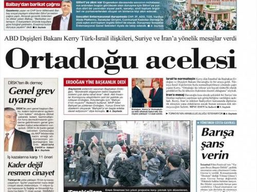 « Η βιασύνη για τη Μέση Ανατολή» είναι ο τίτλος της Cumhuriyet. H τουρκική εφημερίδα κάνει αναφορά στην επίσκεψη Κέρι στην Τουρκία και αναφέρει πως ο αμερικανός υπουργός Εξωτερικών «έστειλε μηνύματα προς το Ισραήλ, τη Συρία αλλά και το Ιράν».