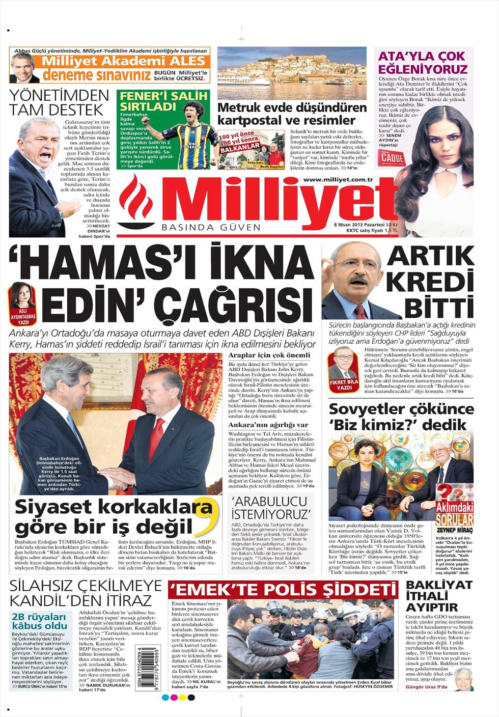 “Κάλεσμα «πείστε τη Χαμάς»”είναι ο τίτλος της Μilliyet. H τουρκική εφημερίδα γράφει πως ο Τζον Κέρι ζητησε από την Άγκυρα να πείσει τη Χαμάς για να αφήσει τα όπλα και να αναγωρίσει το Ισραήλ. «Οι ΗΠΑ περιμένουν από την Άγκυρα να κάνει τη χρήση του ειδικού βάρους της στη διπλωματία και να πείσει τους Παλαιστίνιους για ειρήνευση στη Μέση Ανατολή» γράφει η Μilliyet.