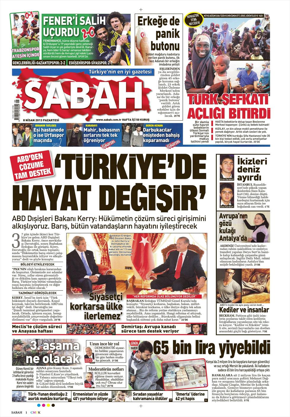 “Θα αλλάξει η ζωή στην Τουρκία» είναι ο τίτλος της Sabah. H τουρκική εφημερίδα αναφέρει πως ο αμερικανός Υπουργός Εξωτερικών στηρίζει την προσπάθεια ειρήνευσης στο Κουρδικό ζήτημα «και εξέφρασε την ικανοποίηση τους σχετικά με τις προσπάθειες της τουρκικής κυβέρνησης προς την κατεύθυνση αυτή» γράφει η εφημερίδα.