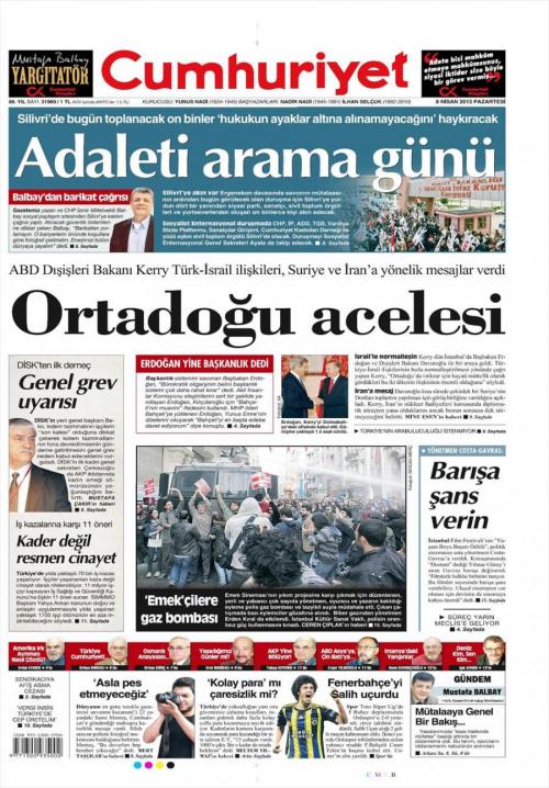 « Η βιασύνη για τη Μέση Ανατολή» είναι ο τίτλος της Cumhuriyet. H τουρκική εφημερίδα κάνει αναφορά στην επίσκεψη Κέρι στην Τουρκία και αναφέρει πως ο αμερικανός υπουργός Εξωτερικών «έστειλε μηνύματα προς το Ισραήλ, τη Συρία αλλά και το Ιράν».