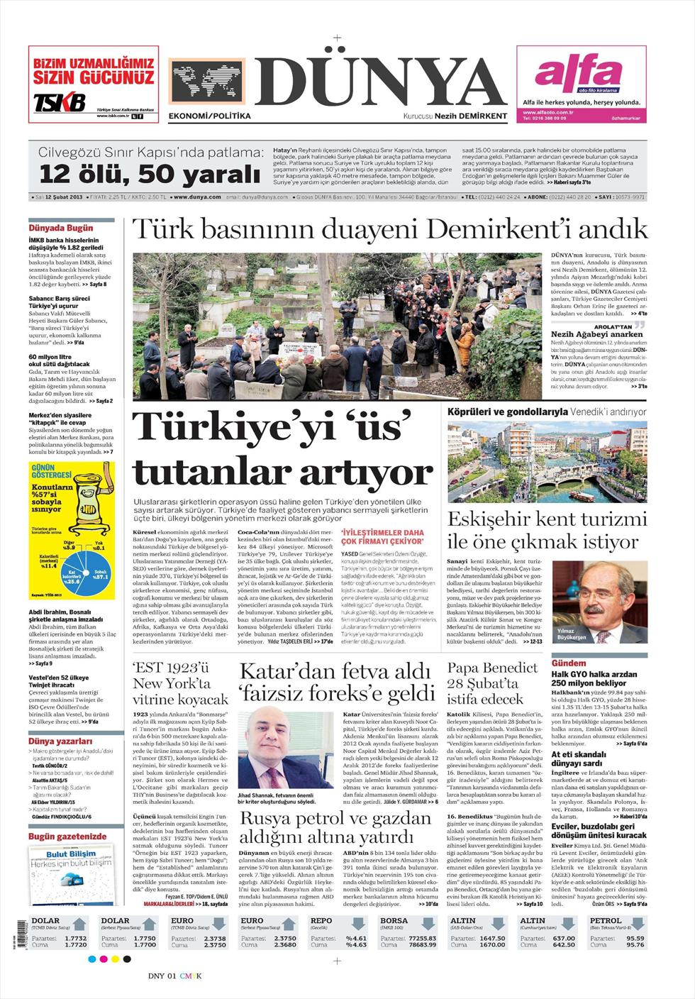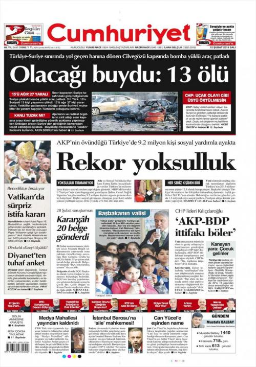 «Αυτό θα συνέβαινε:13 νεκροί» είναι ο τίτλος της Cumhuriyet. H τουρκική εφημερίδα αναφέρεται στη χθεσινή έκρηξη αυτοκινήτου στα σύνορα Τουρκίας-Συρίας και τονίζει πως πως «το τελωνείο Τζιβέγκιοζου στα σύνορα Τουρκίας-Συριας όπου τους τελευταίους μήνες είχε γίνει σημείο που περνούσαν όλοι εξερράγη βόμβα σε όχημα»