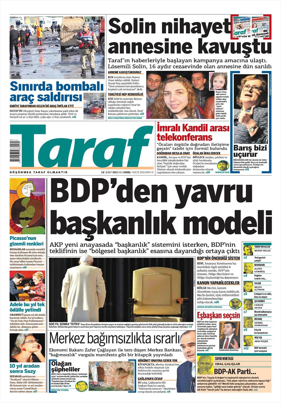 «Πρόταση από το Κόμμα Ειρήνης και Δημοκρατίας για “μικρές προεδρίες”» είναι ο τίτλος της Taraf. H τουρκική εφημερίδα γράφει πως το φιλο-κουρδικό Κόμμα στα πλαίσια των συζητήσεων για τη Συνταγματική αναθεώρηση αντί του προεδρικού συστήματος που επιδιώκει ο Ερντογάν και το Κόμμα Δικαιοσύνης και Ανάπτυξης, προτείνει τοπικούς προέδρους ανα περιοχές που θα έχουν αυξημένες αρμοδιότητες και όλοι μαζί θα δημιουργούν ένα μεγάλο συμβούλιο.