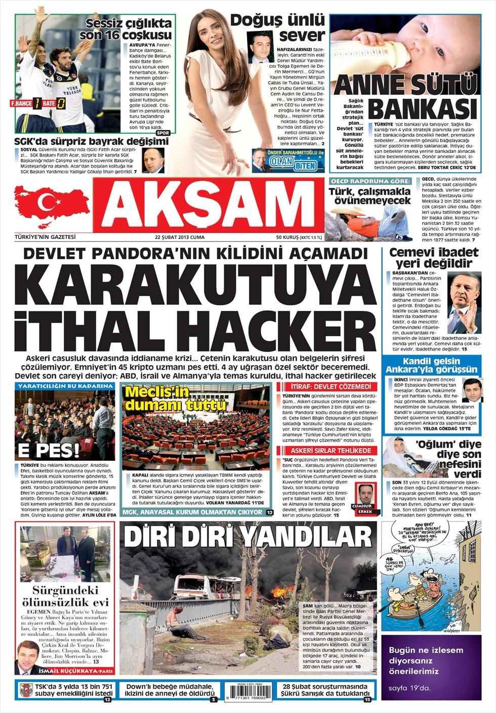 «Εισαγόμενος χάκερ για το μαύρο κουτί» είναι ο τίτλος της Akşam. H τουρκική εφημερίδα αναφέρει πως «το κράτος δεν κατάφερε να ανοίξει το κουτί της Πανδώρας». Το θέμα αφορά τη δίκη για το κύκλωμα κατασκοπείας που έχουν συλληφθεί δεκάδες άνθρωποι με την κατηγορία της διαρροής στρατιωτικών μυστικών. Αλλά τα δεδομένα που υπήρχαν στους υπολογιστές, καθώς 45 ειδικοί της Ασφάλειας δεν κατάφεραν να αποκρυπτογραφήσουν τα δεδομένα από το αρχείο που έχει το όνομα «Πανδώρα».