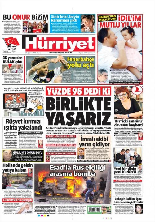 «Μπορούμε να ζούμε μαζί» είναι ο τίτλος της Hürriyet. H τουρκική εφημερίδα γράφει πως το Κόμμα Δικαιοσύνης και Ανάπτυξης πραγματοποίησε μια δημοσκόπηση όπου το 95% των ερωτηθέντων απάντησε πως «Τούρκοι και Κούρδοι μπορούμε στο μέλλον να ζούμε μαζί ». Επίσης σύμφωνα με την εφημερίδα το 51% του λαού υποστηρίζει πως πρέπει να γίνονται συνομιλίες με τον Αμντουλάχ Οτζαλάν.