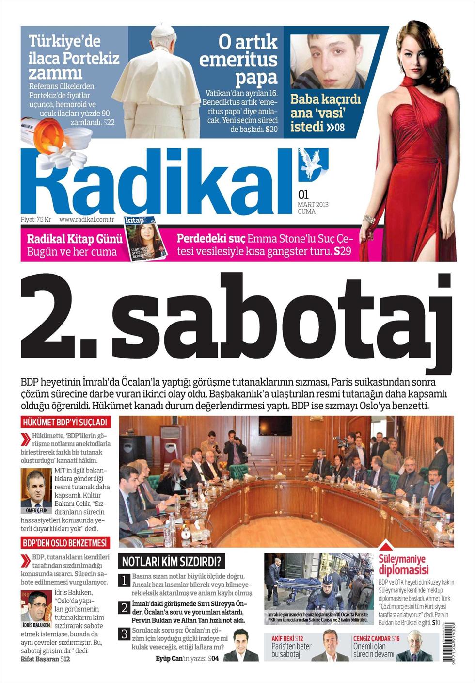 “ Δεύτερο σαμποτάζ» είναι ο τίτλος της Radikal. H τουρκική εφημερίδα αναφέρεται στη διαρροή των πρακτικών και τονίζει πως «μετά τις συνομιλίες του Όσλο ήρθε η σειρά του σαμποτάζ και στις συνομιλίες του Οτζαλάν με τους βουλευτές. Η κυβέρνηση ενοχλήθηκε με τη διαρροή ενώ το κόμμα Ειρήνης και Δημοκρατίας ανέφερε πως το θέμα αυτό θυμίζει το σαμποτάζ των συνομιλιών στο Όσλο».