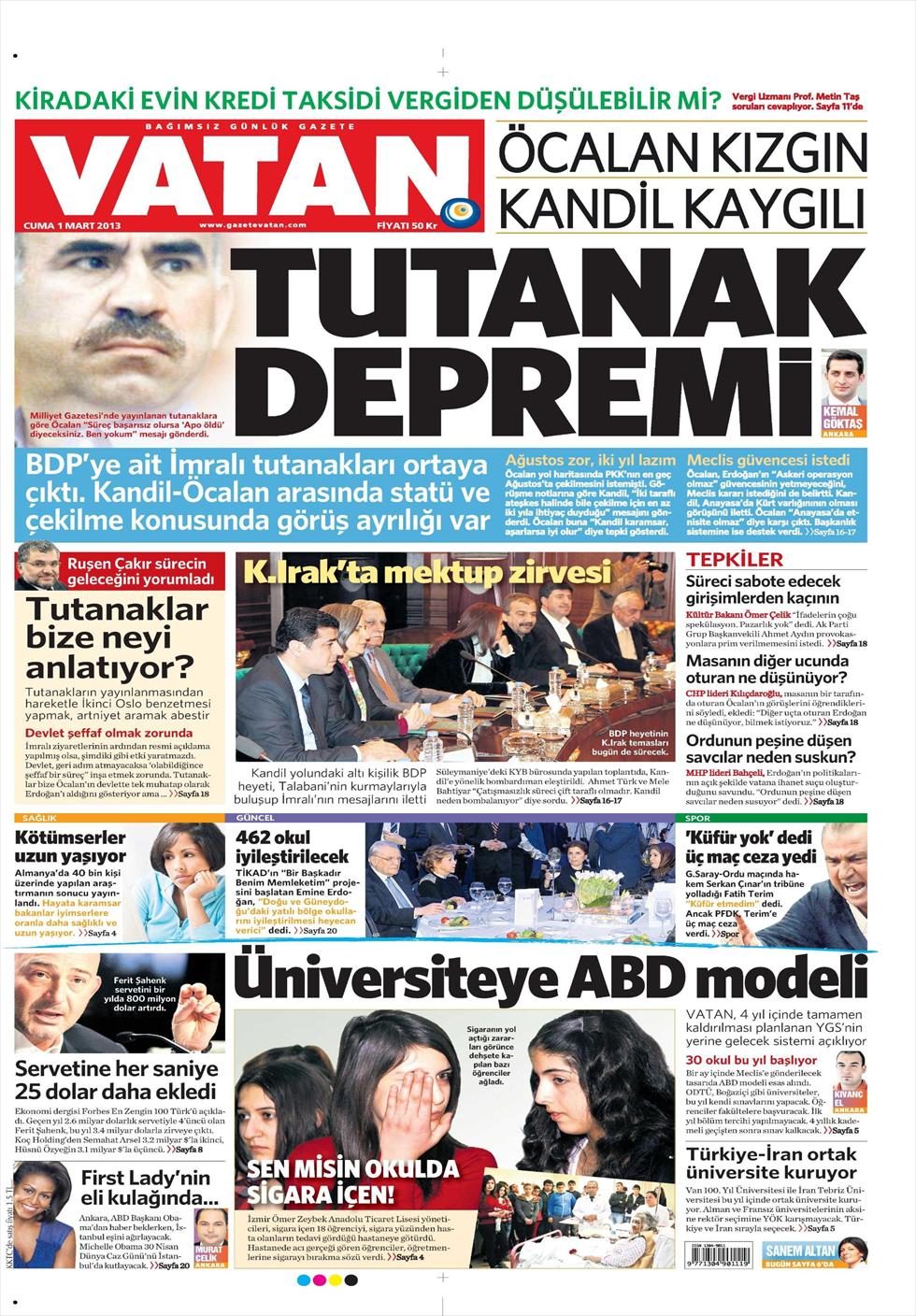 «Σεισμός των πρακτικών» είναι ο τίτλος της Vatan. H τουρκική εφημερίδα γράφει πως ο Οτζαλάν έχει εκνευριστεί από τη διαρροή του περιεχομένου των συνομιλιών ενώ η ηγεσία του PKK στο Βόρειο Ιράκ εκφράζει επιφυλάξεις για τις εξελίξεις. «Υπάρχουν σοβαρές διαφωνίες ανάμεσα στο όρος Κάντιλ (σ.σ. ηγεσία του PKK στο Βόρειο Ιράκ) και στον Οτζαλάν σχετικά με τον τρόπο υποχώρησης των ανταρτών» γράφει η Vatan.