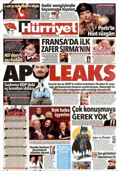 “Apoleaks” είναι ο τίτλος της Hürriyet. H τουρκική εφημερίδα αναφέρεται στη διαρροή των πρακτικών των συνομιλιών του Αμντουλάχ Οτζαλάν με τους Κούρδους βουλευτές και γράφει πως «η διαρροή θυμίζει την υπόθεση των εγγράφων που είχε δημοσιεύσει το Wikileaks».