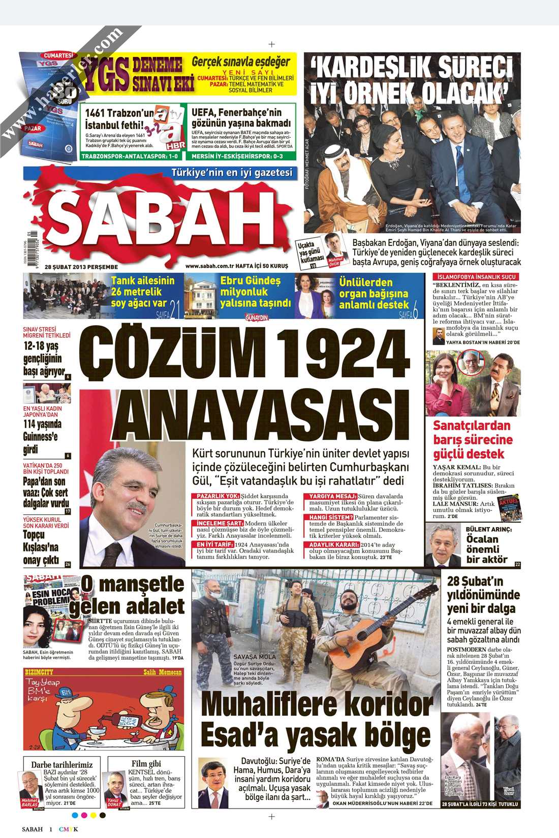 «Η λύση είναι το Σύνταγμα του 1924» είναι ο τίτλος της Sabah. H τουρκική εφημερίδα αναφέρεται στις δηλώσεις του προέδρου της Τουρκίας Αμντουλάχ Γκιούλ ο οποίος τονίζει πως αν στο νέο Σύνταγμα «προστεθεί ο όρος του «ισότιμου πολίτη όπως περιγράφεται στο Σύνταγμα του 1924 τότε θα λυθούν πολλά ζητήματα και πολλές διαφωνίες για το Κουρδικό ζήτημα».
