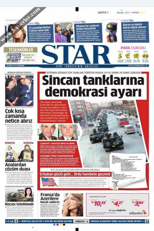 «Δημοκρατική ισορροπία στα τανκς του Σίντζαν» είναι ο τίτλος της τουρκικής εφημερίδας Star και αναφέρεται στη σύλληψη του πρώην αρχηγού του Στρατού Ξηράς Ερντάλ Τζεϊλάνογλου και του πρώην διοικητή της Ακαδημίας Πολέμου Αρσλάν Γκιουνέρ οι οποίοι το 1997 είχαν δώσει εντολή της εξόδου των τανκς από το στρατόπεδο στην περιοχή Σίντζαν της Άγκυρας και να κυκλοφορήσουν στους δρόμους , ως απειλή στην τότε ισλαμική κυβέρνηση Ερντογάν. Οι δυο πρωην αξιωματικοί, κατηγορούνται για συμμετοχή στο «μετα-μοντέρνο»πραξικόπημα εναντίον του τότε πρωθυπουργού Νετζμετίν Ερμπακάν.