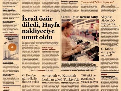 « Το Ισραήλ ζήτησε συγγνώμη η Χάϊφα έγινε η ελπίδα των μεταφορέων» είναι ο τίτλος της οικονομικής εφημερίδας Dünya. H τουρκική εφημερίδα αναφέρει πως « οι μεταφορείς που δεν μπορούσαν να μεταφέρουν προϊόντα στη Μέση Ανατολή λόγω του πολέμου στη Συρία ετοιμάζονται να πραγματοποιήσουν δρομολόγια πλοίων για τη μεταφορά φορτηγών προς τις χώρες της Μέσης Ανατολής μέσω του λιμανιού της Χάϊφας».