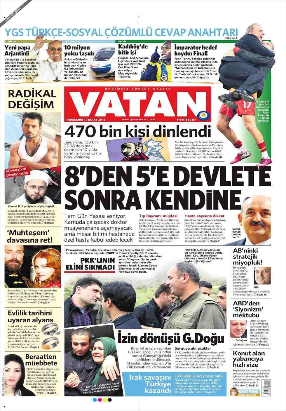 «8 με 5 για το δημόσιο μετά για τον εαυτό σου» είναι ο τίτλος της Vatan. H τουρκική εφημερίδα γράφει πως το τουρκικό δημόσιο υποχρεώνει τους γιατρούς του δημοσίου να εργάζονται από το πρωί μέχρι τις 5 αλλά θα τους δίνει τη δυνατότητα να εξετάζουν ασθενείς τους ακόμη και μέσα στο νοσοκομείο.