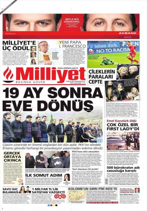 « Επιστροφή στο σπίτι μετά από 19 μήνες» είναι ο τίτλος της Milliyet. H τουρκική εφημερίδα αναφέρεται στο θέμα της απελευθέρωσης 8 ομήρων από το PKK. “Ενα σημαντικό βήμα για την επίλυση του Κουρδικού και παραδόθηκαν οι όμηροι χωρίς καμία προβοκάτσια» γράφει η Milliyet.