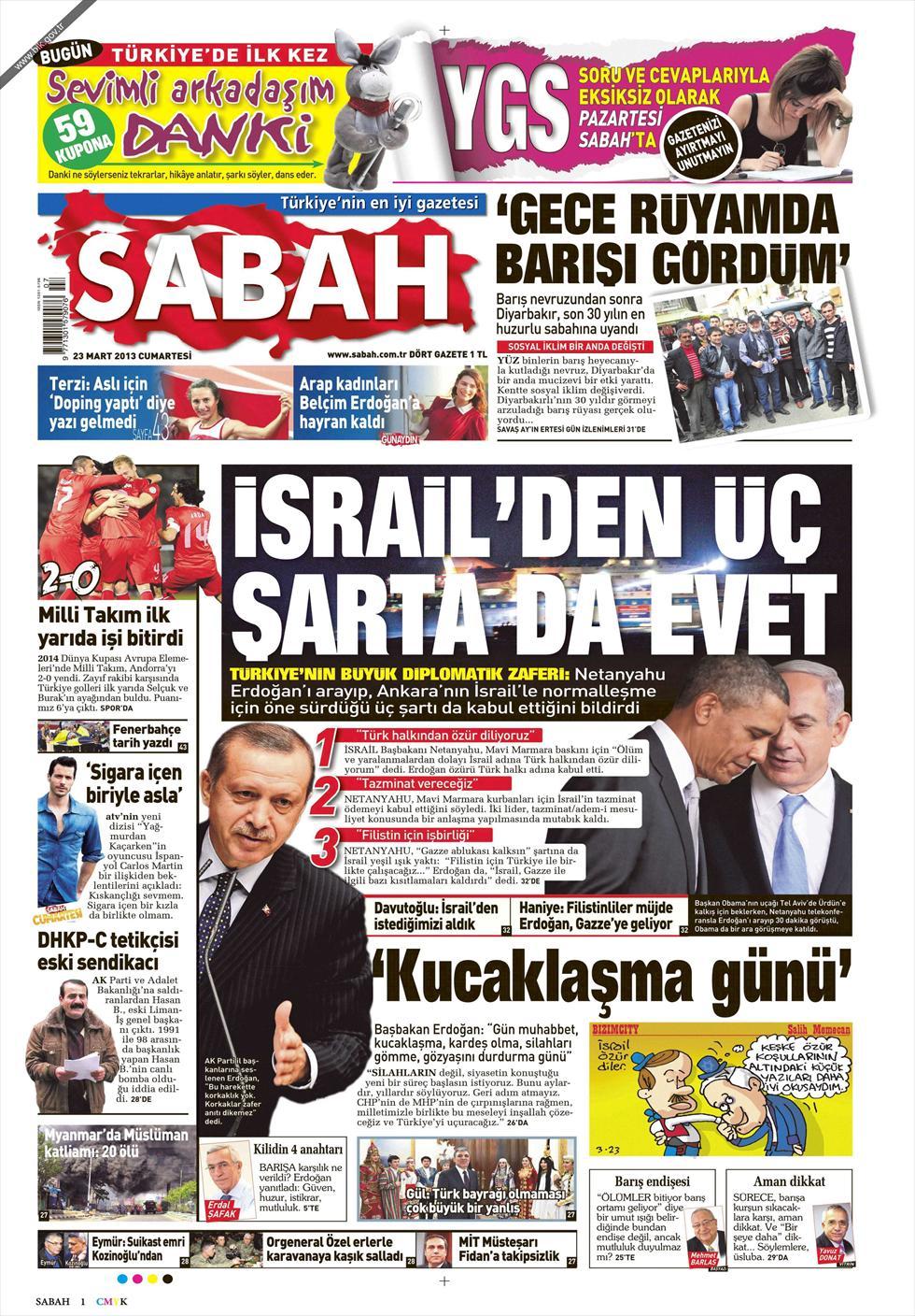 « Ναι από το Ισραήλ και στους τρεις όρους» είναι ο τίτλος της Sabah. H τουρκική εφημερίδα σχολιάζει και γράφει πως « αυτό είναι μια διπλωματική νίκη της Τουρκίας. Ο Νετανγιάχου κάλεσε τον Ερντογάν και δήλωσε πως δέχεται και τους τρεις όρους που είχε θέσει η Τουρκία για την ομαλοποίηση των σχέσεων των δυο χωρών».