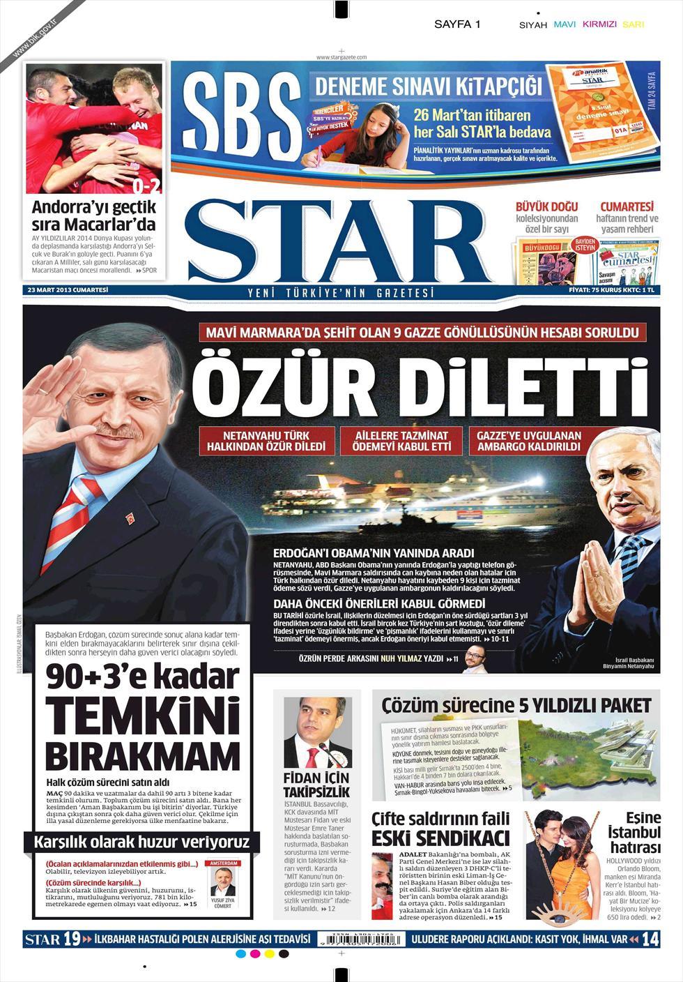 « Του έκανε να ζητήσει συγγνώμη» είναι ο τίτλος της Star. H τουρκική εφημερίδα αναφέρει πως « το Τελ Αβίβ πληρώνει το λογαριασμό όλων όσων έχει κάνει. Ικανοποιεί όλα τα αιτήματα της Τουρκίας δηλαδή ζήτησε συγγνώμη, καταβάλλει αποζημιώσεις στα θύματα και χαλαρώνει το εμπάργκο στη Γάζα».