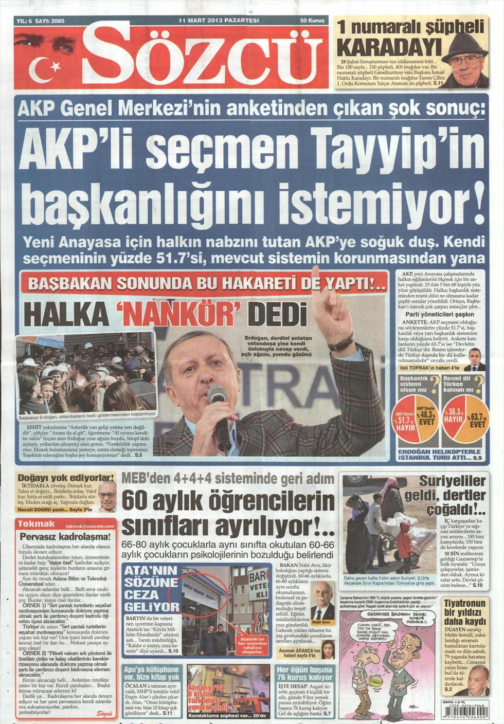 «Οι ψηφοφόροι του AKP δεν θέλουν τον Ερντογάν ως πρόεδρο» είναι ο τίτλος της Sözcü. H τουρκική εφημερίδα αναφέρει πως σε δημοσκόπηση του ίδιου του κυβερνώντος κόμματος Δικαιοσύνης και Ανάπτυξης (AKP) το 51.4% όσων ψηφίζουν το ΑΚP δεν θέλουν τον Ερντογάν στην προεδρία της δημοκρατίας.