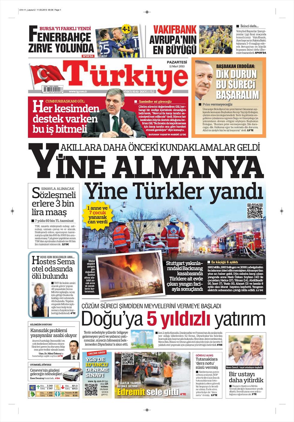 «Πάλι η Γερμανία πάλι κάηκαν Τούρκοι» είναι ο τίτλος της Τürkiye. H τουρκική εφημερίδα γράφει την πυρκαγιά που ξέσπασε σε σπίτι στη Στουτγάρδη όπου σκοτώθηκε μια μητέρα και τα επτά παιδιά της. Η Türkiye υπενθυμίζει παλαιότερες πυρκαγιές που είχαν ξεσπάσει λόγω εμπρησμών.
