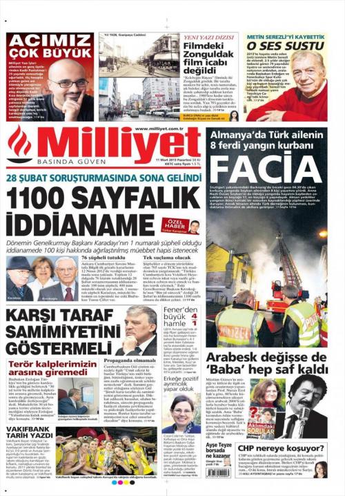 «Κατηγορητήριο 1100 σελίδων» είναι ο τίτλος της Milliyet. H τουρκική εφημερίδα αναφέρει πως οι εισαγγελέας έχει ολοκληρώσει το κατηγορητήριο του για την υπόθεση της δίκης του «μετα-μοντέρνου» πραξικοπήματος της 28ης Φεβρουαρίου του 1997 εναντίον της ισλαμικής κυβέρνησης Ερμπακάν. Η εφημερίδα γράφει πως βασικός κατηγορούμενος της υπόθεσης θα είναι ο πρώην αρχηγός των τουρκικών Ενόπλων Δυνάμεων Ισμαίλ Χακί Καράνταγι.