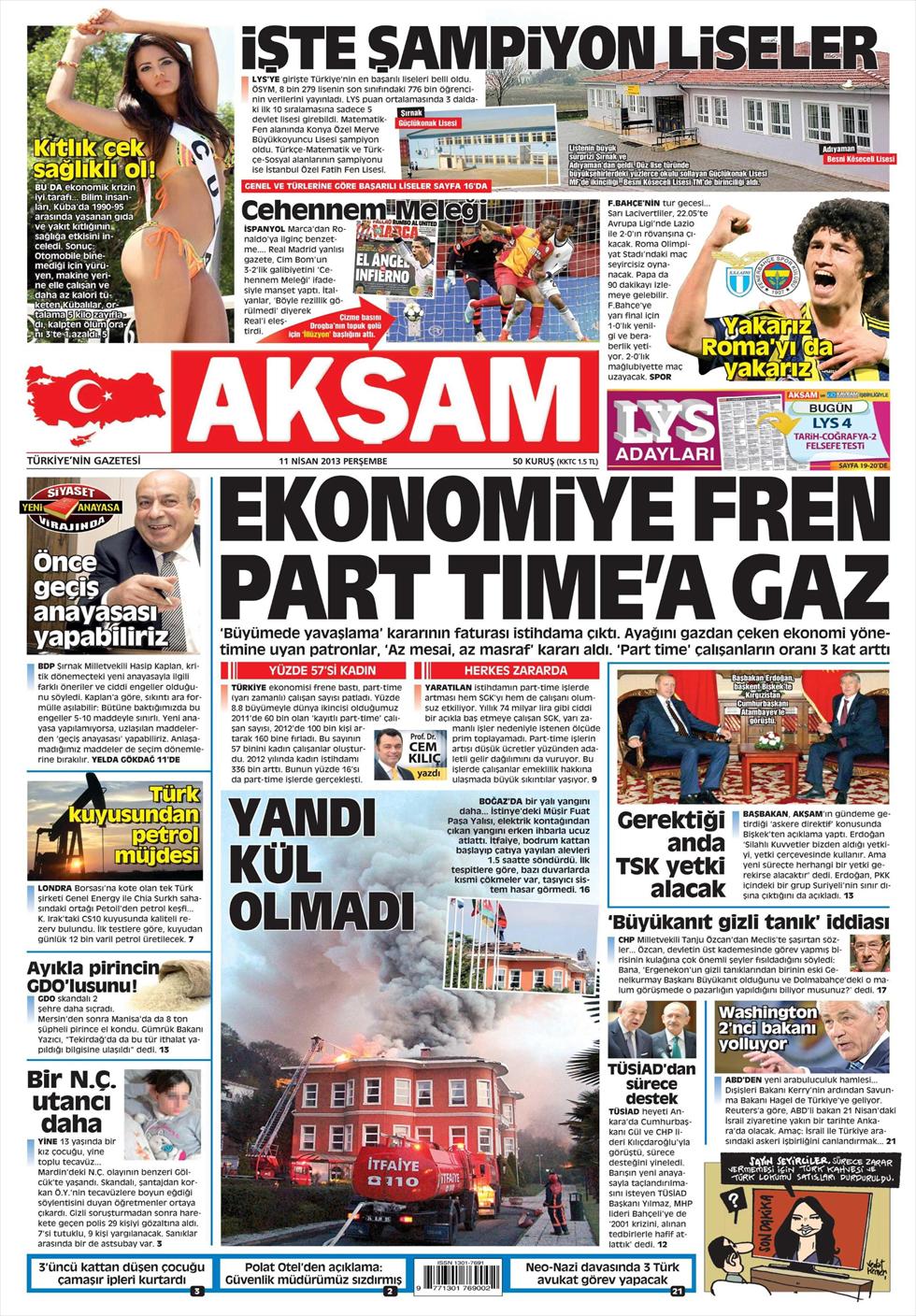 «Φρένο στην οικονομία γκάζι στο part-time» είναι ο τίτλος της Akşam. H τουρκική εφημερίδα αναφέρει πως «η απόφαση της τουρκικής κυβέρνησης για μείωση του ρυθμού της ανάπτυξης επηρρέασε και τους επιχειρηματίες που ακολούθησαν τις αποφάσεις αυτές μειώνοντας τις θέσεις εργασίας αλλά κυρίως αυξάνοντας την part-time εργασία. Ο αριθμός των εργαζομένων “part-time” τριπλασιάστηκε μέσα μόλις σε ένα χρόνο»