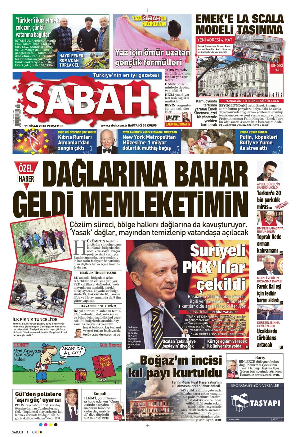 «Ήρθε η άνοιξη στα βουνά της πατρίδας μου» είναι ο τίτλος της Sabah. H τουρκική εφημερίδα αναφέρει πως με την μείωση της έντασης στη νοτιοανατολική Τουρκία και την απόσυρση των Κούρδων ανταρτών, τα βουνά της περιοχής θα «καθαρίσουν» από νάρκες και θα επιτρέπεται και πάλι στους κατοίκους να ανεβαίνουν στα βουνά.