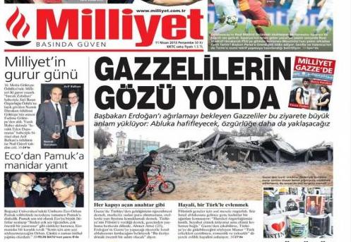 «Οι κάτοικοι της Γάζας κοιτάζουν το δρόμο» είναι ο τίτλος της Milliyet. H τουρκική εφημερίδα αναφέρεται στο επικείμενο ταξίδι του Ρετζέπ Ταγίπ Ερντογάν στη Γάζα και αναφέρει πως «οι Παλαιστίνιοι περιμένουν με αγωνία την επίσκεψη του Ερντογάν καθώς ελπίζουν πως θα αρθεί το εμπάργκο και θα βελτιωθούν οι συνθήκες διαβίωσης τους».