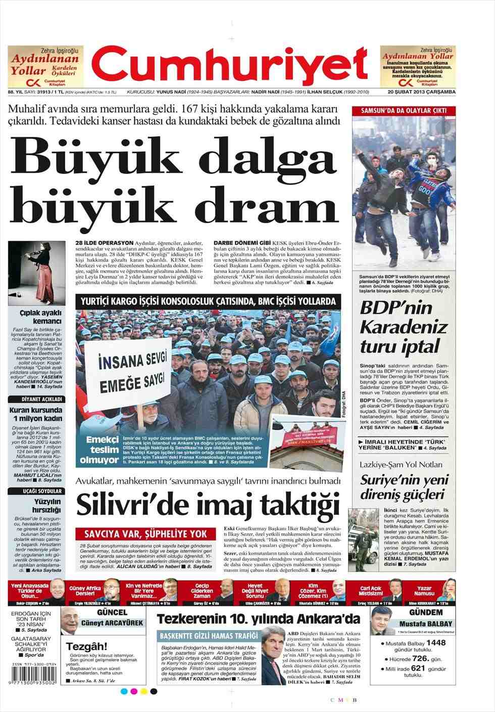 «Μεγάλο κύμα, μεγάλα δράματα» είναι ο τίτλος της Cumhuriyet. H τουρκική εφημερίδα αναφέρεται στο κύμα συλλήψεων και γράφει πως «η σειρά για την αποσιώπηση της αντιπολίτευσης ήρθε στους δημοσιους υπαλλήλους ενώ συνελήφθησαν ακόμη και καρκινοπαθείς».