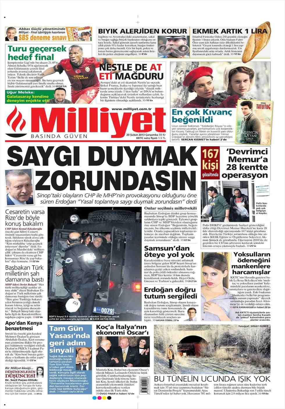 «Είσαι υποχρεωμένος να τους σεβαστείς» είναι ο τίτλος της Milliyet. H τουρκική εφημερίδα αναφέρεται σε δηλώσεις του Ερντογάν ο οποίος κατηγόρησε τα μέλη των κομμάτων τις αντιπολίτευσης που εμπόδισαν την περιοδεία των Κούρδων βουλευτών στις πόλεις της βόρειας Τουρκίας.