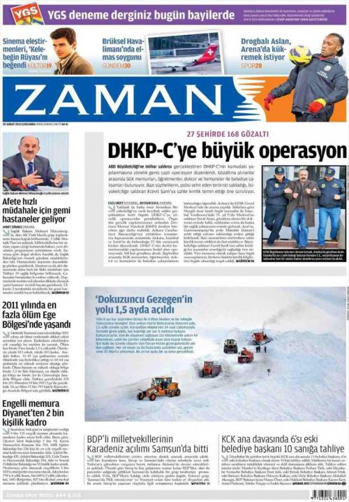 “Mεγάλη επιχείρηση εναντίον της οργάνωσης DHKP-C” είναι ο τίτλος της Zaman. H τουρκική εφημερίδα αναφέρει πως σε επιχείρηση της αστυνομίας σε 27 πόλεις συνελήφθησαν 168 άτομα. «Ανάμεσα στους συλληφθέντες βρίσκονται δάσκαλοι, νοσοκόμες, γιατροί, δημόσιοι υπάλληλοι» γράφει η εφημερίδα.