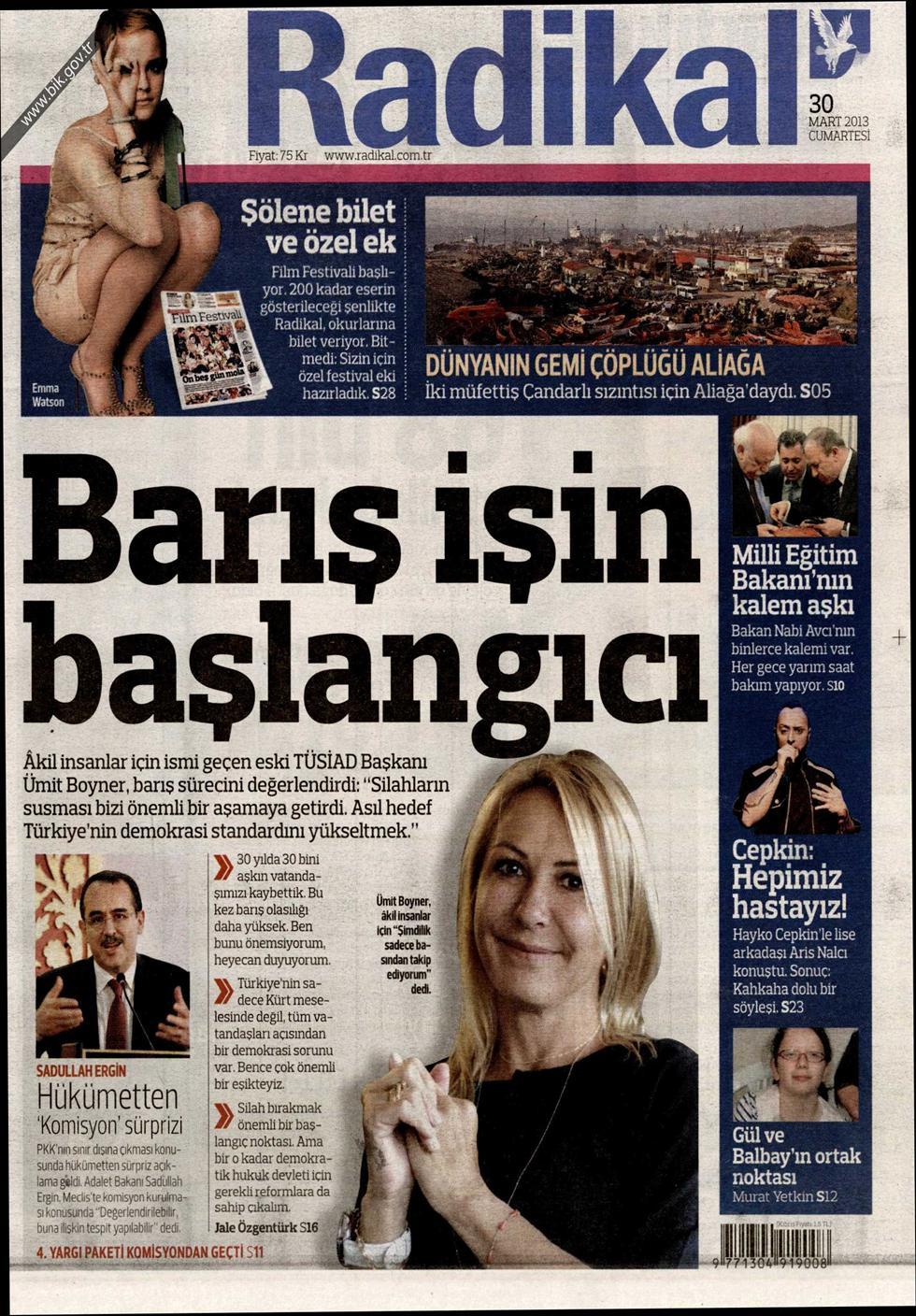 «Η ειρήνευση είναι μόνο η αρχή» είναι ο τίτλος της Radikal. Η τουρκική εφημερίδα αναφέρεται σε δηλώσεις της προέδρου του Επιμελητηρίου Βιομηχάνων της Τουρκίας Ουμίτ Μπόγνερ, η οποία τονίζει πως « από εδώ και πέρα θα πρέπει να αυξήσουμε το επίπεδο της δημοκρατίας στην Τουρκία».