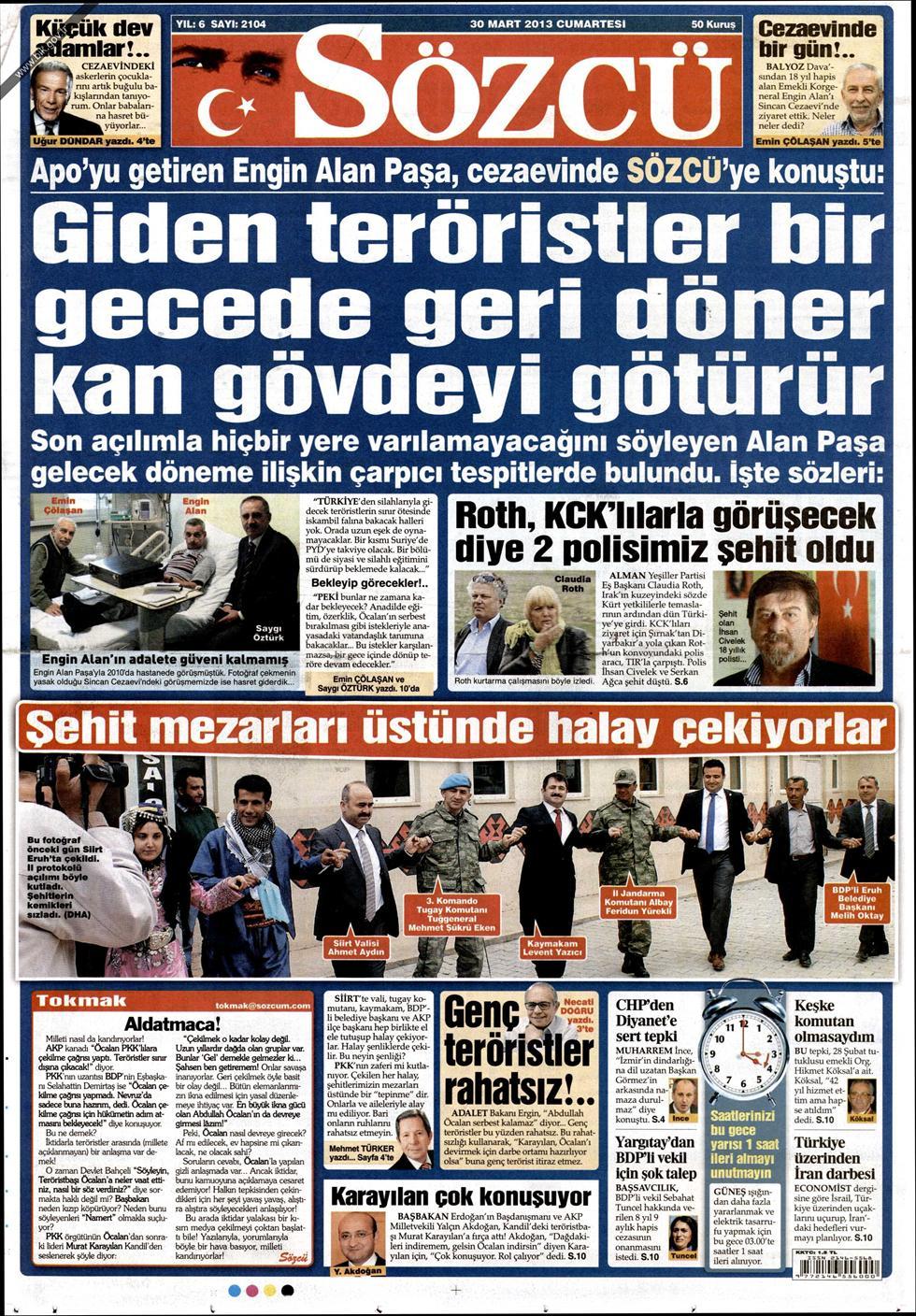 «Οι τρομοκράτες που θα αποχωρούν θα μπορούν να επιστρέφουν μέσα σε μια νύχτα και να γίνει και πάλι μακελειό», είναι ο τίτλος της της Sözcü. H τουρκική εφημερίδα κάνει αναφορά στις δηλώσεις του πρήωην στρατηγού Εγκίν Αλάν ο οποίος υποστηρίζει «πως η αποχώρηση των ανταρτών δεν σημαίνει και το τέλος της δράσης της κουρδικής οργάνωσης.»