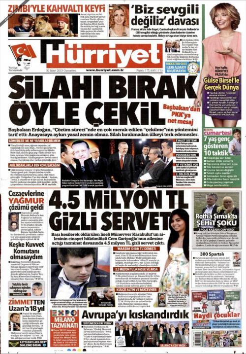 «Να αφήσεις τα όπλα κι έτσι να αποχωρήσεις» είναι ο τίτλος της Star. H τουρκική εφημερίδα αναφέρεται σε δηλώσεις του Ρετζέπ Ταγίπ Ερντογάν ο οποίος μίλησε για τον τρόπο αποχώρησης των Κούρδων ανταρτών από την Τουρκία με κατεύθυνση το βόρειο Ιράκ. « Δεν μπορούμε να παραβιάσουμε το Σύνταγμα όσοι θα αποχωρούν θα πρέπει να αφήσουν τα όπλα τους» δήλωσε ο Ερντογάν.