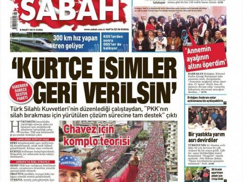 « Να επιστραφούν τα Κουρδικά τοπωνύμια» είναι ο τίτλος της Sabah. H τουρκική εφημερίδα αναφέρει πως σε μελέτη που πραγματοποίησαν οι τουρκικές ένοπλες δυνάμεις, στηρίζουν την προσπάθεια της επίλυσης του Κουρδικού ζητήματος, και προτείνουν την μείωση των εθνικιστικών απόψεων στα βιβλία της ιστορίας και την επιστροφή των κουρδικών τοπωνυμίων στις περιοχές της νοτιοανατολικής Τουρκίας.