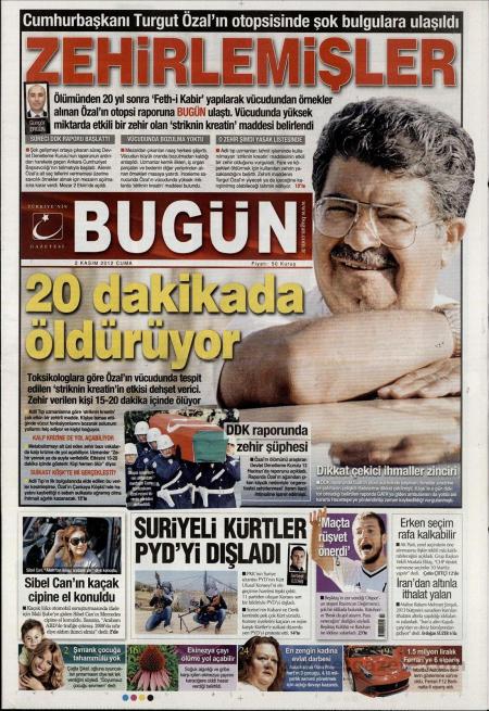 «Τον δηλητηρίασαν» είναι ο τίτλος της τουρκικής εφημερίδα Bugun. H τουρκική εφημερίδα αναφέρει πως οι τοξικολογικές έρευνες δείχνουν πως στα οστά του Οζάλ βρέθηκε δηλητήριο η οποία σύμφωνα με την εφημερίδα μπορεί να σκοτώσει μέσα σε 20 λεπτά.