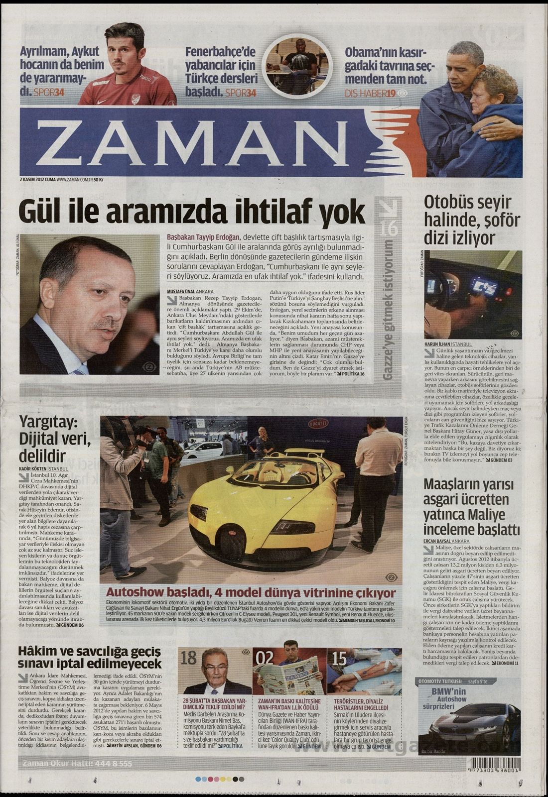 «Δεν έχουμε καμία διαφορά με τον Γκιούλ» είναι ο τίτλος της Ζaman. H τουρκική εφημερίδα αναφέρει πως ο τούρκος πρωθυπουργός με τις δηλώσεις του, έβαλε τέλος στα σενάρια που ανέφεραν πως υπάρχει «κόντρα» ανάμεσα στον Ερντογάν και τον πρόεδρο της Τουρκίας.