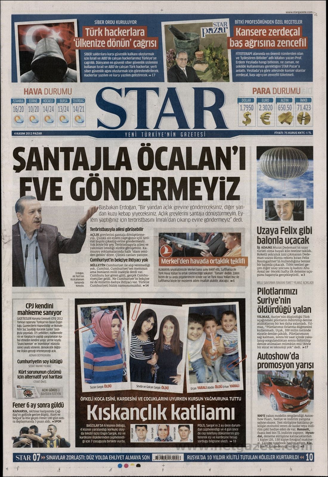 «Με τους εκβιασμούς, δεν θα στείλουμε τον Οτζαλάν στο σπίτι του» είναι ο τίτλος της Star. H τουρκική εφημερίδα γράφει πως ο Ερντογάν ξεκαθάρισε πως «με τις απεργίες πείνας δεν θα πετύχετε το στόχο σας για να στείλουμε τον Οτζαλάν από τη φυλακή στο σπίτι του, με τις απειλές δεν λειτουργεί ένα κράτος»
