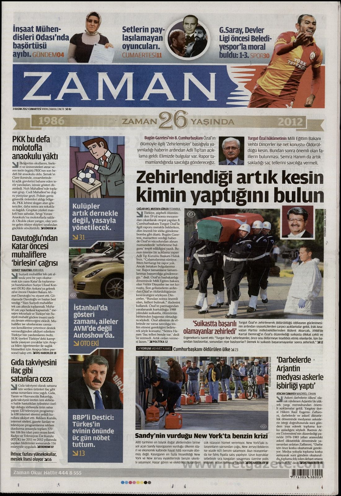 «Είναι σίγουρο πως τον δηλητηρίασαν, βρείτε τους ενόχους» είναι ο τίτλος της Zaman. Η τουρκική εφημερίδα κάνε αναφορά στο θέμα των ερευνών για τη δηλητηρίαση του Τουργκούτ Οζάλ και τονίζει πως ο πρώην υπουργός παιδείας Βεχμπί Ντίντσερλερ , της κυβέρνησης Οζάλ δηλώνει σίγουρος πως «κάποιοι είχαν δηλητηριάσει τον πρώην πρόεδρο της Τουρκίας»