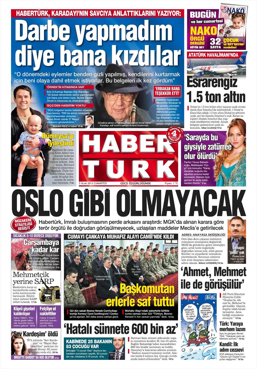 «Δεν θα γίνει όπως στο Όσλο» είναι ο τίτλος της Habertürk. H τουρκική εφημερίδα αναφέρει πως η κυβέρνηση Ερντογάν αποφάσισε να μην γίνονται απ’αυθείας διαπραγματεύσεις με το PKK αλλά με έμμεσο τρόπο όπως με τον Οτζαλάν και οι όροι τις κάθε συμφωνίας θα έρθουν προς ψήφιση στο Κοινοβούλιο.