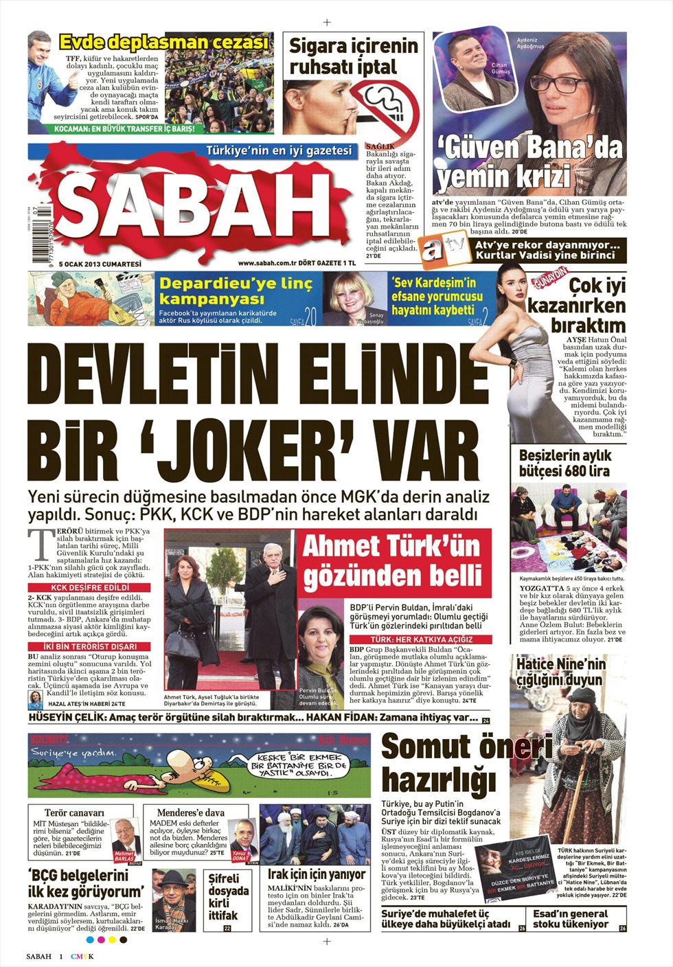 «Το κράτος στο χέρι του κρατάει ένα τζόκερ» είναι ο τίτλος της Sabah. H τουρκική εφημερίδα αναφέρει πως η τουρκική κυβέρνηση εκτιμά πως το Κόμμα Ειρήνης και Δημοκρατίας αλλά και το PKK έχουν χάσει τη δυναμική τους αλλά και τους χώρους ελιγμών τους γι’αυτό και έχουν κάτσει στο τραπέζι των διαπραγματεύσεων