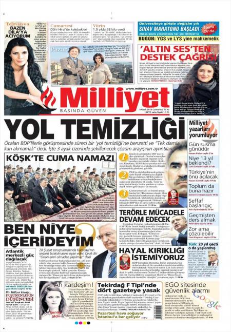 «Καθαρισμός δρόμου» είναι ο τίτλος της Milliyet. H τουρκική εφημερίδα αναφέρεται σε όσα έχει δηλώσει ο Οτζαλάν στους βουλευτές του φιλο-κουρδικού Κόμματος Ειρήνης και Δημοκρατίας. Ο Οτζαλάν τονίζει πως «δεν πρέπει να χυθεί καθόλου αίμα την περίοδο αυτή και να καθαρίσει ο δρόμος».