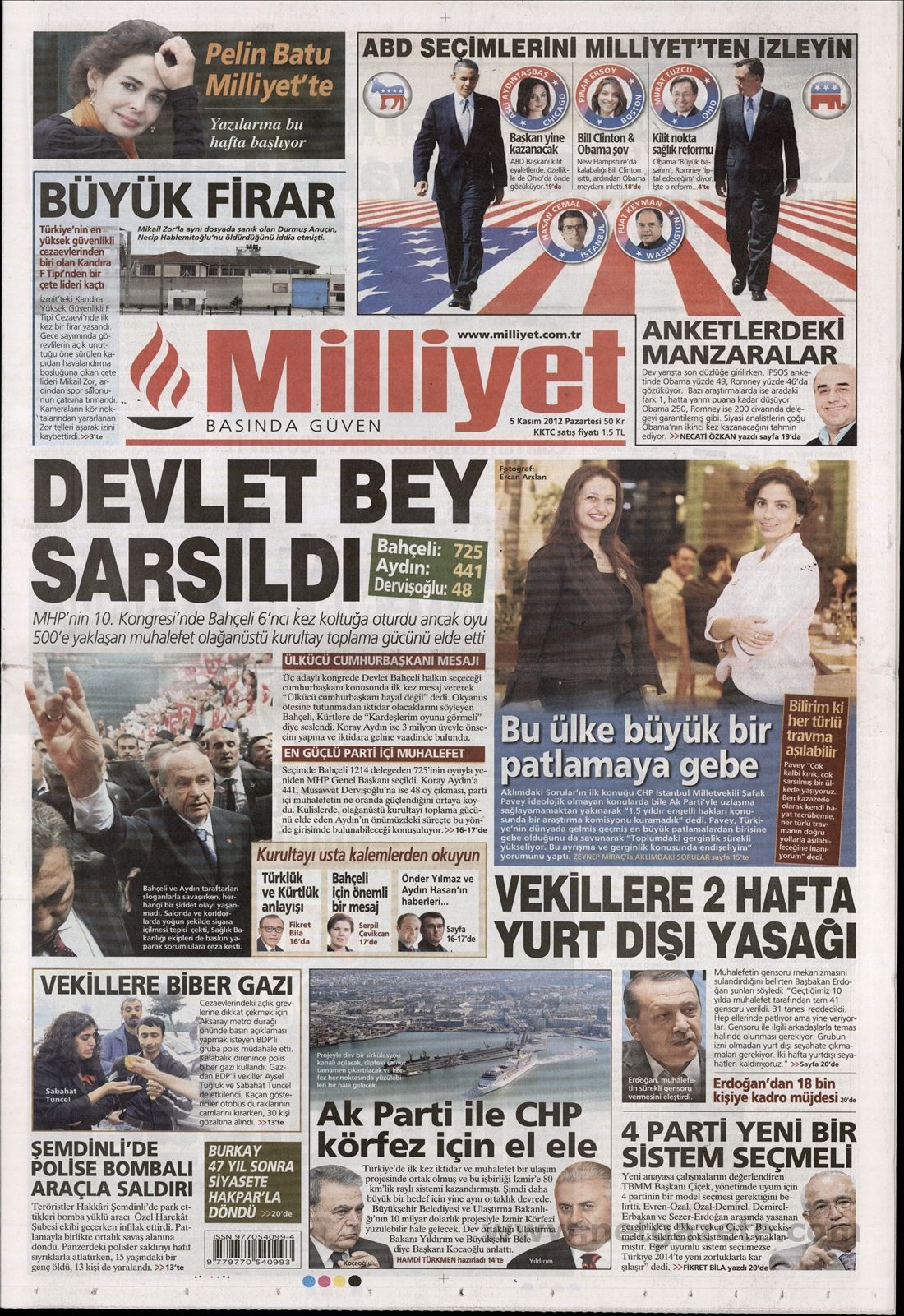 «Ο κύριος Ντεβλέτ τραυματίστηκε» είναι ο τίτλος της Milliyet. H τουρκική εφημερίδα αναφέρει πως ο Ντεβλέτ Μπαχτσελί, κέρδισε το συνέδριο του Κόμματος Εθνικιστικής Δράσης. Η εφημερίδα αναφέρει πως ο Μπαχτσελί μπορεί να κέρδισε αλλά η αντιπολίτευση μέσα στο κόμμα,αύξησε τη δύναμη της.