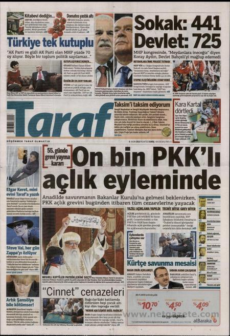 «Σε απεργία πείνας, δέκα χιλιάδες μέλη του PKK» είναι ο τίτλος της Taraf. H τουρκική εφημερίδα αναφέρει πως η κουρδική οργάνωση έχει δώσει εντολή στους κρατούμενους στις τουρκικές φυλακές , να ξεκινήσουν απεργία πείνας προς συμπαράσταση των υπολοίπων απεργών πείνας που έχουν ολοκληρώσει την 55η ημέρα της απεργίας πείνας..