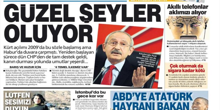 «Συμβαίνουν όμορφα πράγματα» είναι ο τίτλος της Vatan. H τουρκική εφημερίδα γράφει πως ο αρχηγός της αξιωματικής αντιπολίτευσης του Ρεπουμπλικανικού Λαϊκού Κόμματος , ανακοίνωσε πως στηρίζει τις προσπάθειες της κυβέρνησης Ερντογάν για να λυθεί το Κουρδικό ζήτημα. « Αναβιώνουν οι ελπίδες για να σταματήσει η αιματοχυσία» γράφει η εφημερίδα για τις δηλώσεις του Κεμάλ Κιλιτσντάρογλου