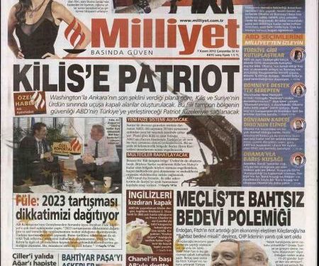 “Patriot στο Κίλις» είναι ο τίτλος της Milliyet. H τουρκική εφημερίδα αναφέρει πως οι ΗΠΑ και η Τουρκία έχιυν διαμορφώσει ένα σχέδιο αεράμυνας. Θα τοποθετηθούν αντιαεροπορικά συστήματα Patriot στην περιοχή κοντά στα σύνορα Τουρκίας Συρίας, όπως και στην Ιορδανία.