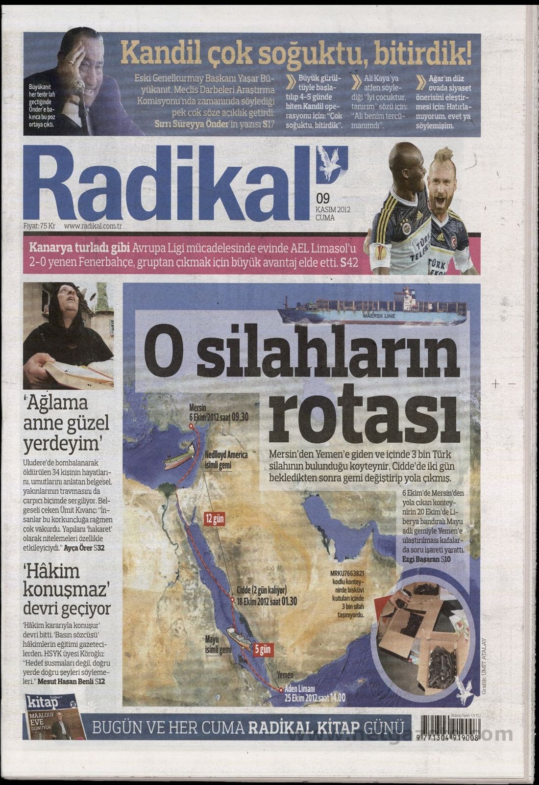 «Η πορεία εκείνων των όπλων» είναι ο τίτλος της Radikal. H τουρκική εφημερίδα αναφέρει πως τα 3000 τούρκικα όπλα που μεταφέρθηκαν στην Υεμένη, δεν πήγαν απ’ευθείας με πλοίο από την Τουρκία αλλά με δεύτερο πλοίο από την Τζέντα της Σαουδικής Αραβίας.